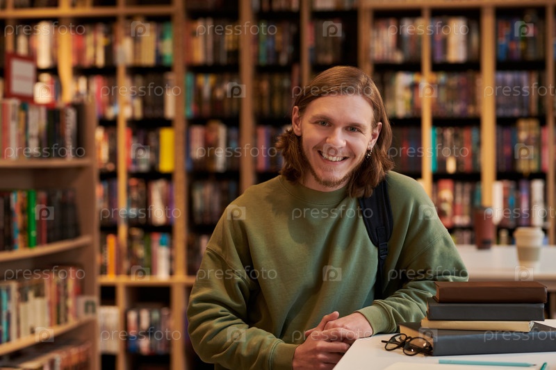 Портрет молодого человека, улыбающегося, сидящего в библиотеке
