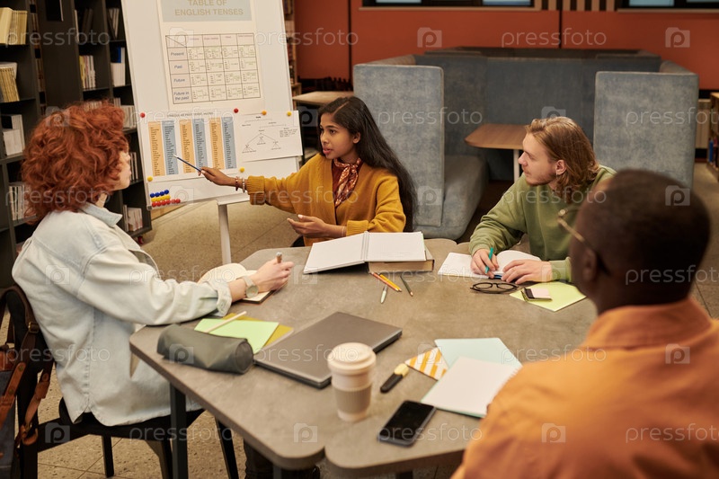 Мультиэтнические подростки, сотрудничающие во время групповой учебной сессии в библиотеке