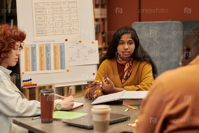 Молодая азиатская женщина объясняет понятия грамматики во время группового изучения