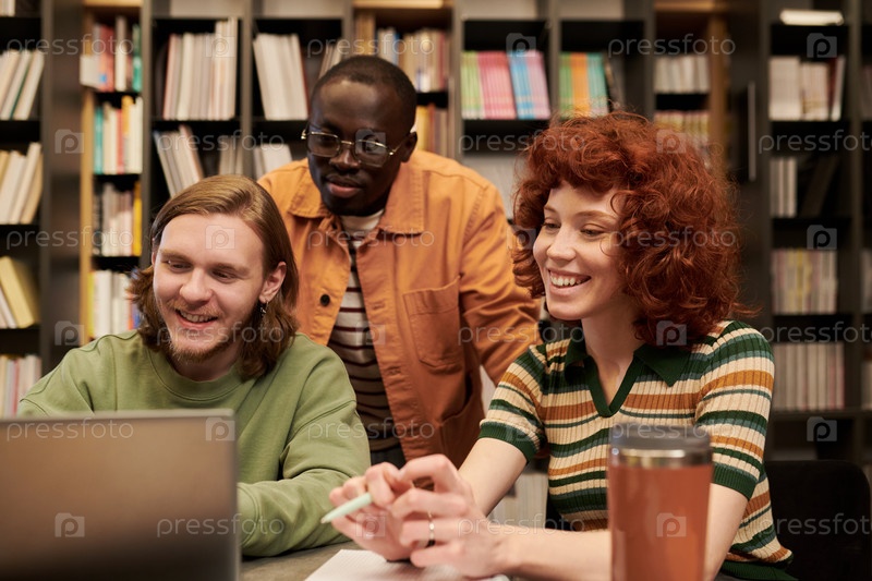 Мультиэтнические молодые люди сотрудничают над проектом в современной библиотечной обстановке
