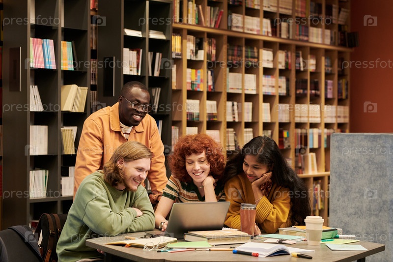 Разнообразная группа молодых людей, сотрудничающих над проектом в библиотечной обстановке