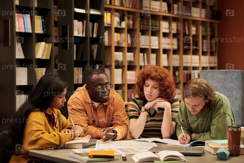 Мультиэтнические молодые люди вместе анализируют учебные материалы в библиотеке