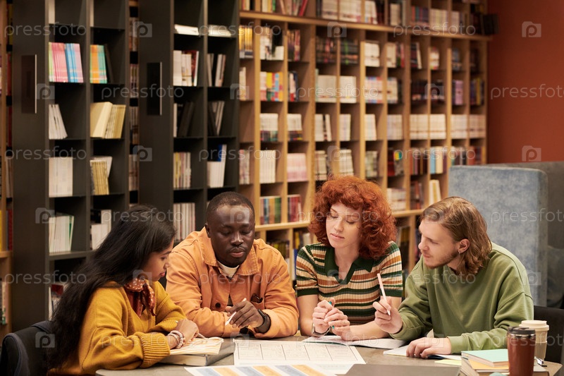 Мультиэтнические молодые люди вместе просматривают учебные материалы в библиотеке