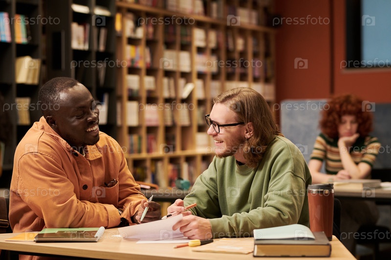 Молодой чернокожий мужчина и молодой человек вместе учатся в библиотеке