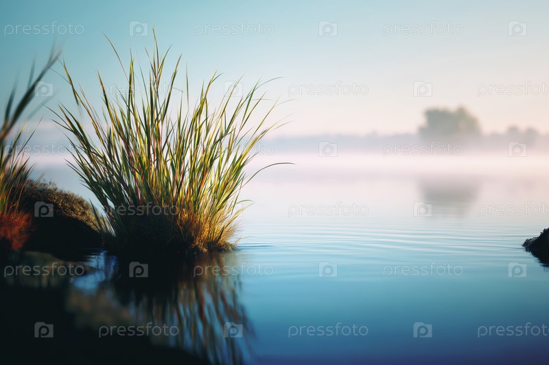 Утренний туман над озером с травой на переднем плане