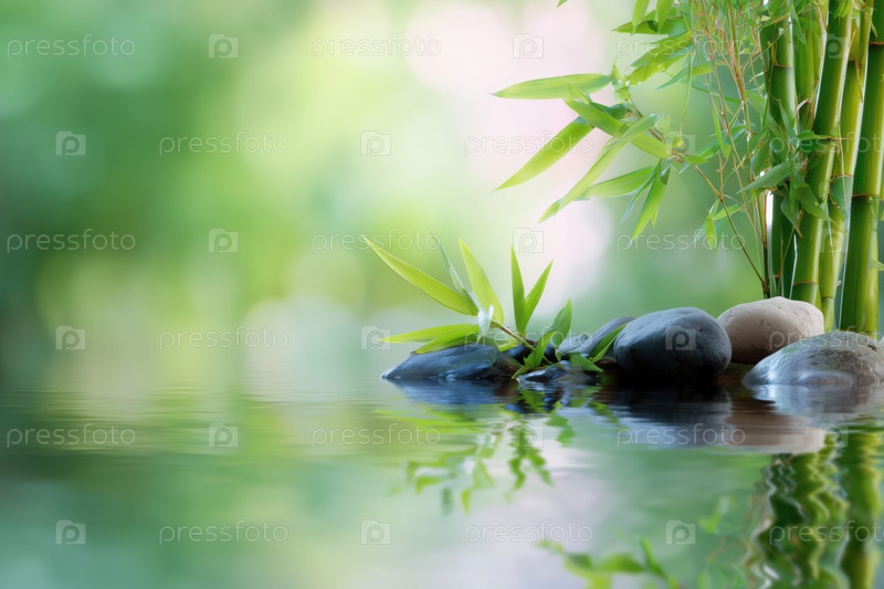 Бамбук и гальки в воде с зеленым фоном боке