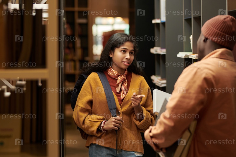 Юная азиатская девушка разговаривает с американцем в коридоре библиотеки