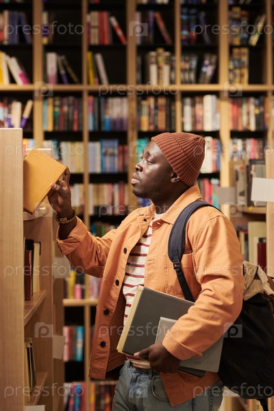 Молодой чернокожий мужчина ищет книжную полку в библиотеке, держа учебники