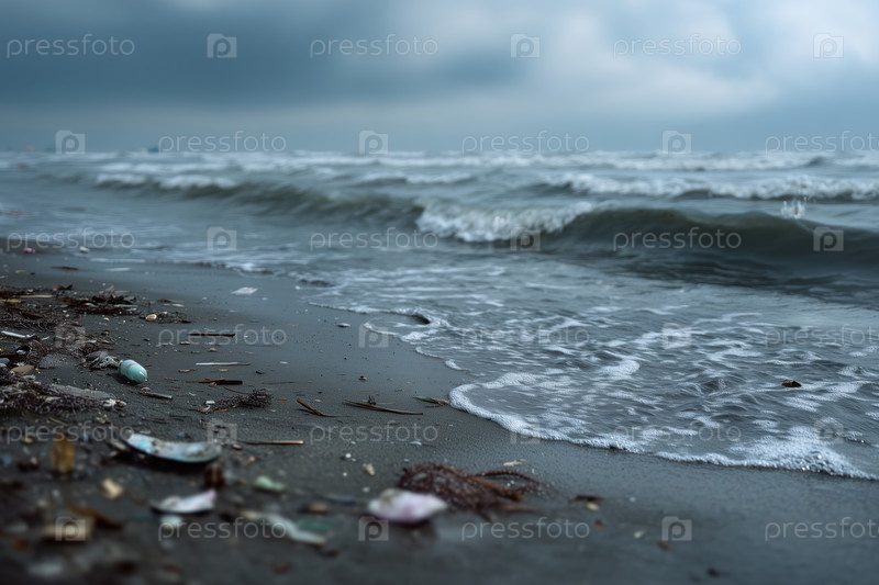 Волны и мусор на берегу моря в бурную погоду