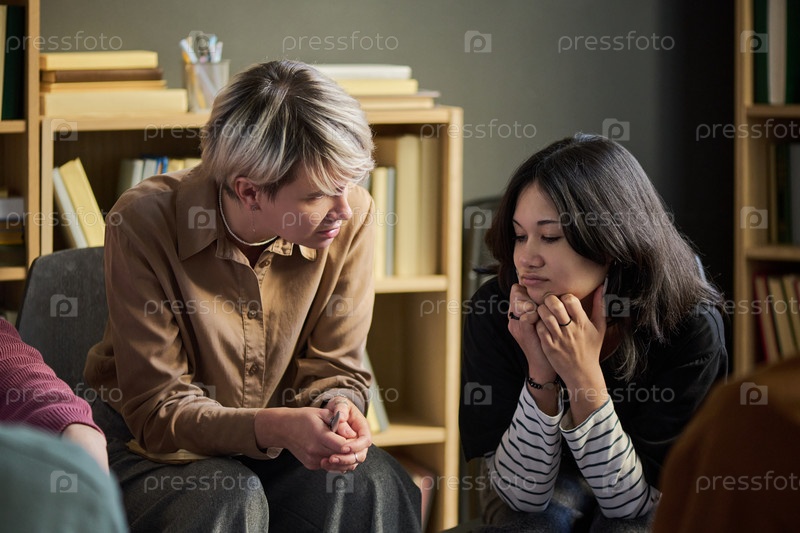 Женщина, поддерживающая девочку-подростка во время групповой терапии взрослых