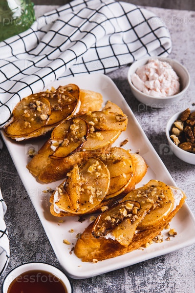 Вкусный тост с сливочным сыром, жареной грушей и медом на тарелке на столе вертикальный вид