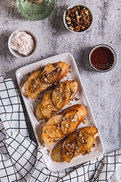 Вкусный тост со сливочным сыром, обжаренной грушей и медом на тарелке сверху и с вертикальным видом