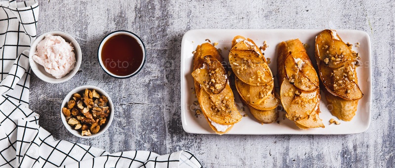 Вкусный тост со сливочным сыром, обжаренной грушей и медом на веб-баннере с видом на тарелку