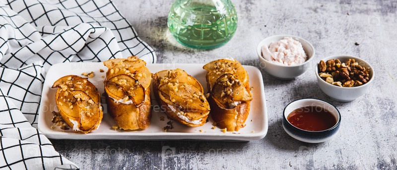 Сладкие бутерброды с рикотой, запечённой грушей, медом и орехами на тарелке у стола