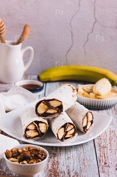 Сладкие булочки с шоколадом и бананом на тарелке на столе с вертикальным видением