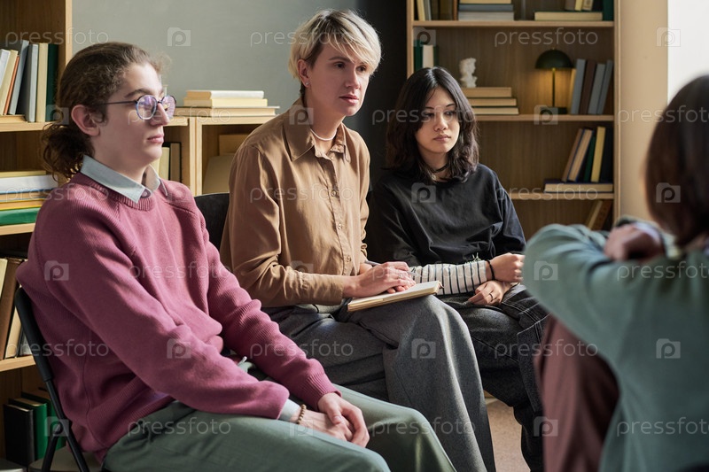 Разнообразные молодые люди участвуют в групповой сессии терапии и внимательно слушают
