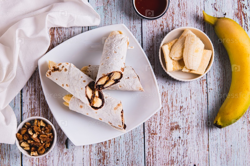 Сладкие рулоны с шоколадом и бананом на тарелке за столом
