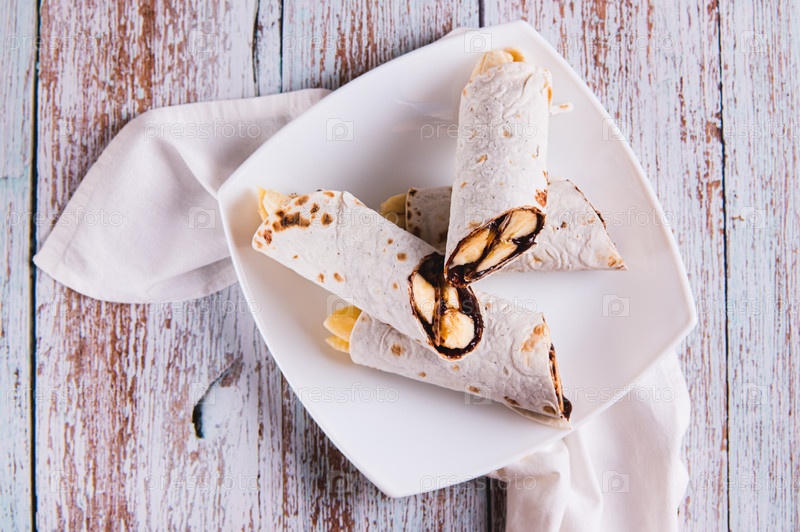 Закройте сладкие рулоны с шоколадом и бананом на тарелке на столе