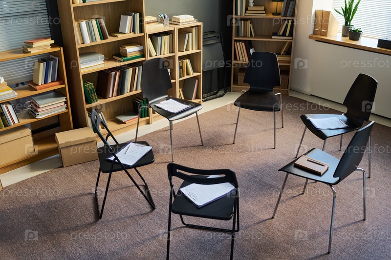 Материалы групповых сессий терапии расположены на стульях в консультационной комнате