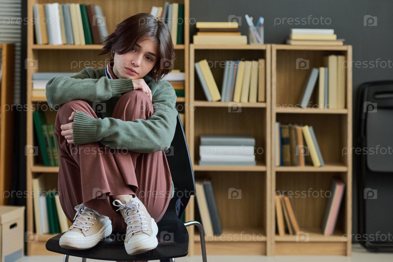 Подростковая девушка сидит одна во время групповой сессии терапии, выглядя грустно