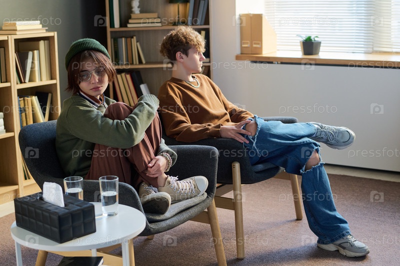 Два молодых человека, сидящих отдельно во время групповой сессии терапии в консультационной комнате