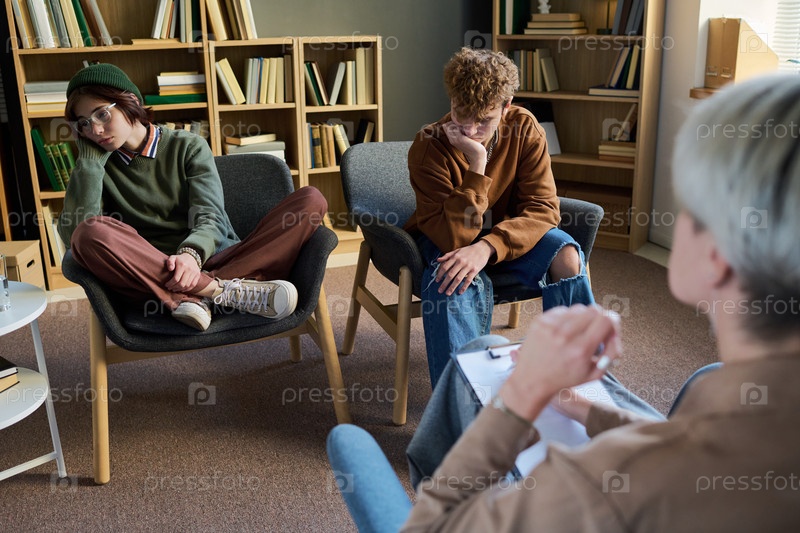 Подростки сидят на групповой сессии терапии и слушают, как говорит консультант