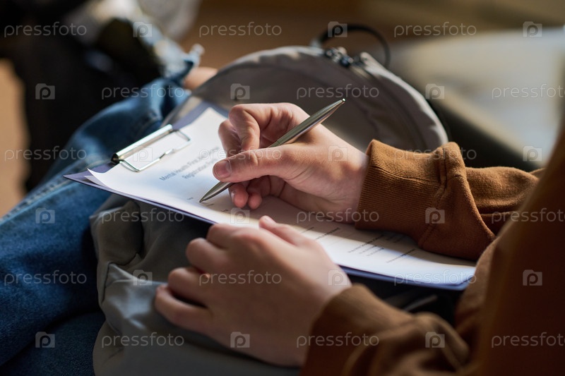 Молодая женщина заполняет форму оценки во время групповой терапии