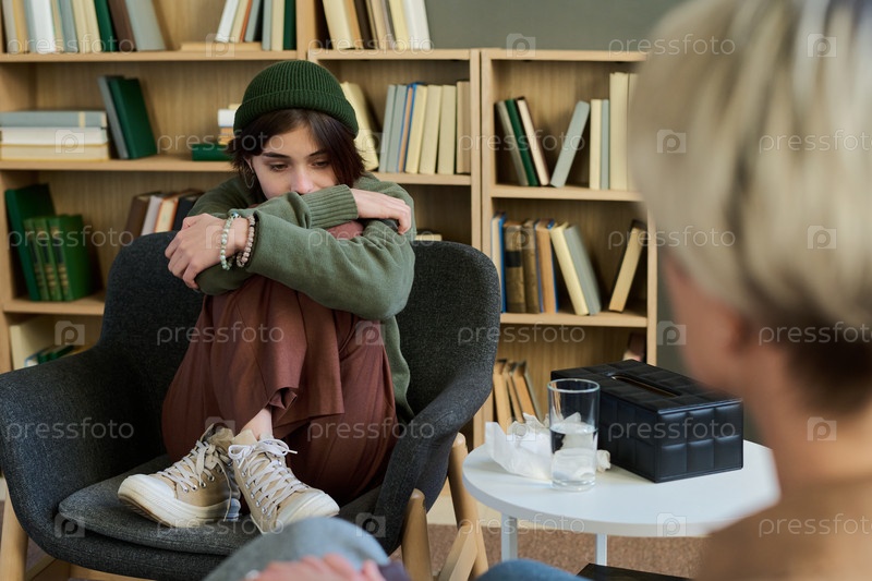 Девушка-подросток сидит в закрытом помещении во время групповой терапии внутри дома