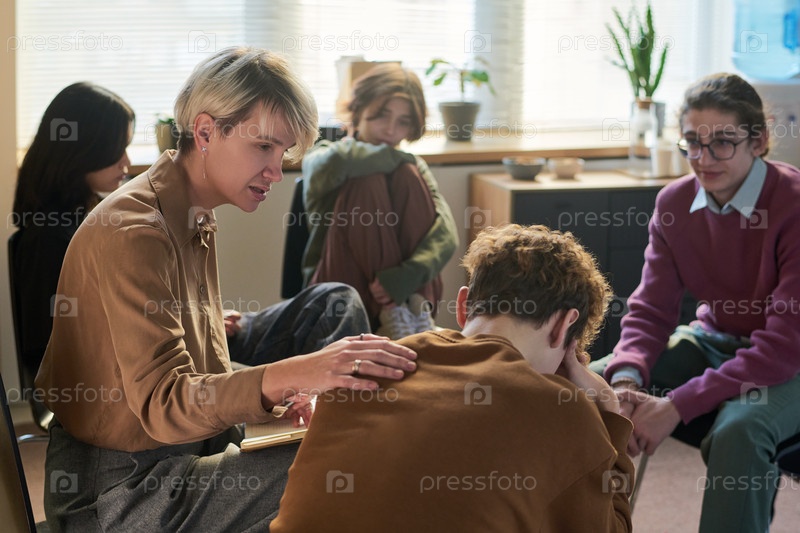 Феминистка-терапевт утешает расстроенного подростка во время групповой терапии