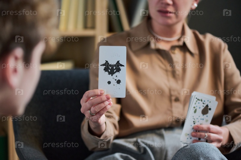 Взрослая женщина ведет групповую терапию с использованием карт чернильных пятен
