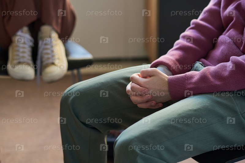 Молодой человек сидит с зажатыми руками во время групповой терапии