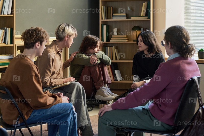 Разнообразные молодые люди, поддерживающие друг друга во время групповой терапии