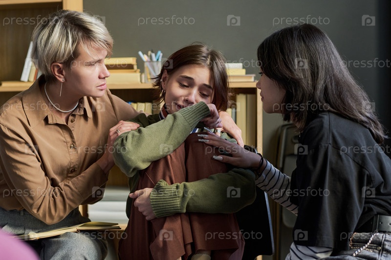 Различные молодые женщины утешают плачущего подростка во время групповой сессии терапии