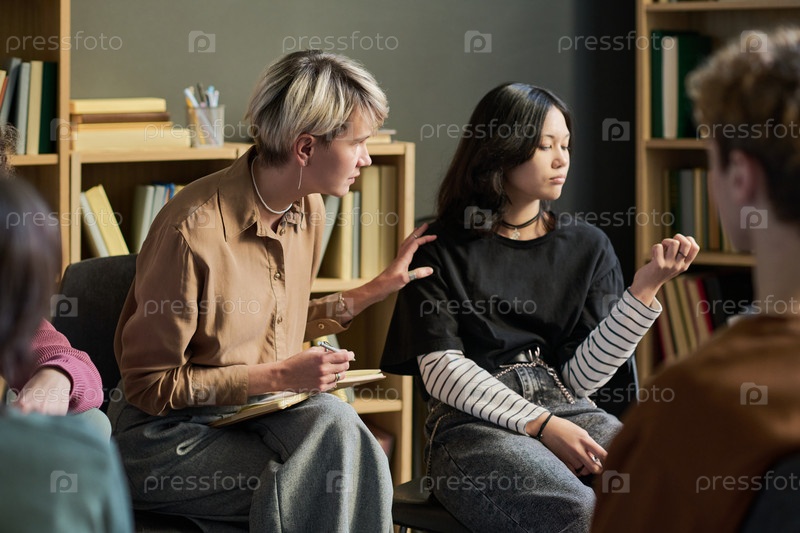 Молодая женщина утешает азиатского подростка во время групповой сессии терапии