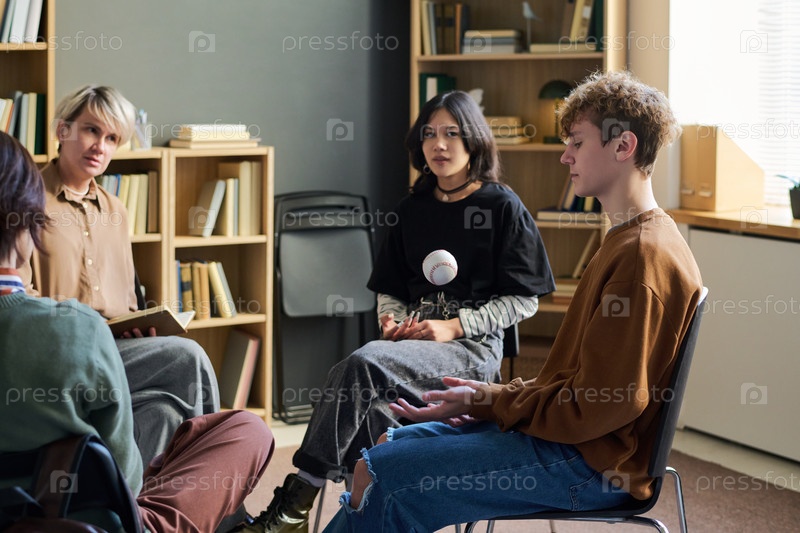 Различные подростки, сидящие в кругу, делятся размышлениями во время групповой терапии