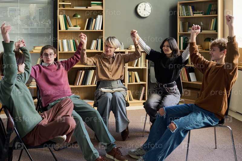 Различные подростки, поднимающие объединенные руки, празднуют прогресс в групповой терапии