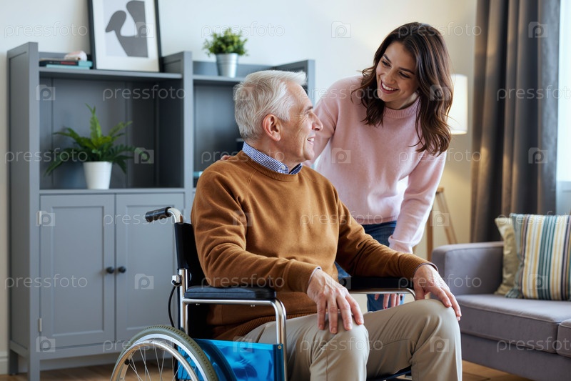 Мужчина с инвалидностью улыбается, разговаривая с молодой старшей женщиной