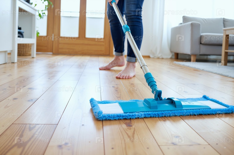 Женщина, убирающая деревянный пол с мопом в гостиной