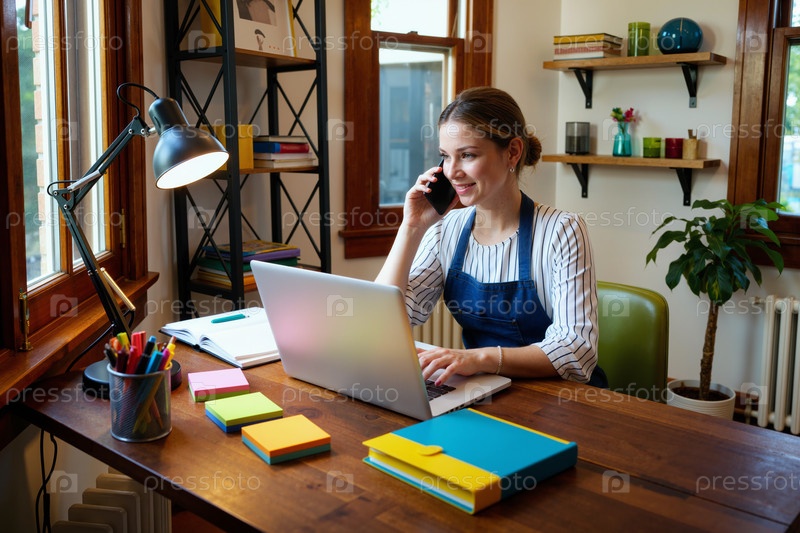 Молодая взрослая женщина работает удаленно с помощью ноутбука и смартфона