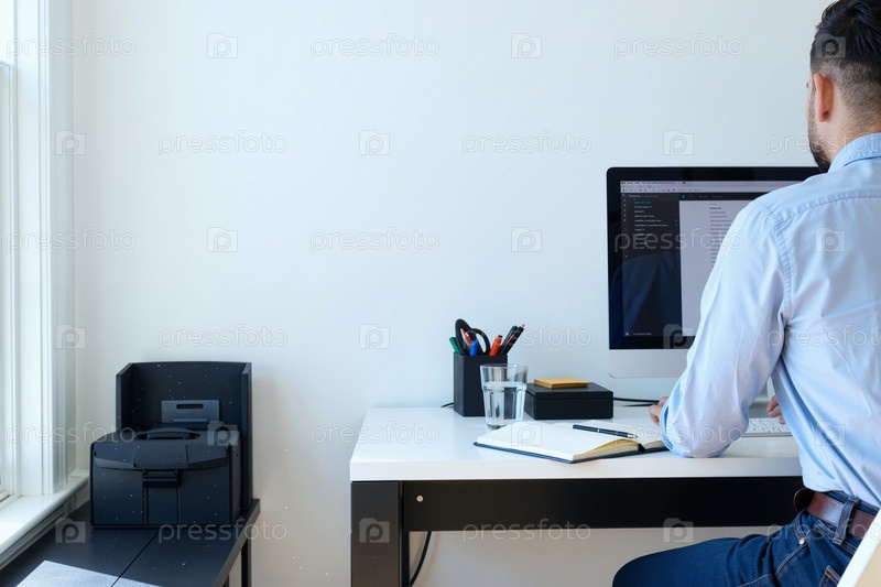 Работа на компьютере в современном офисе Человек с рабочим столом
