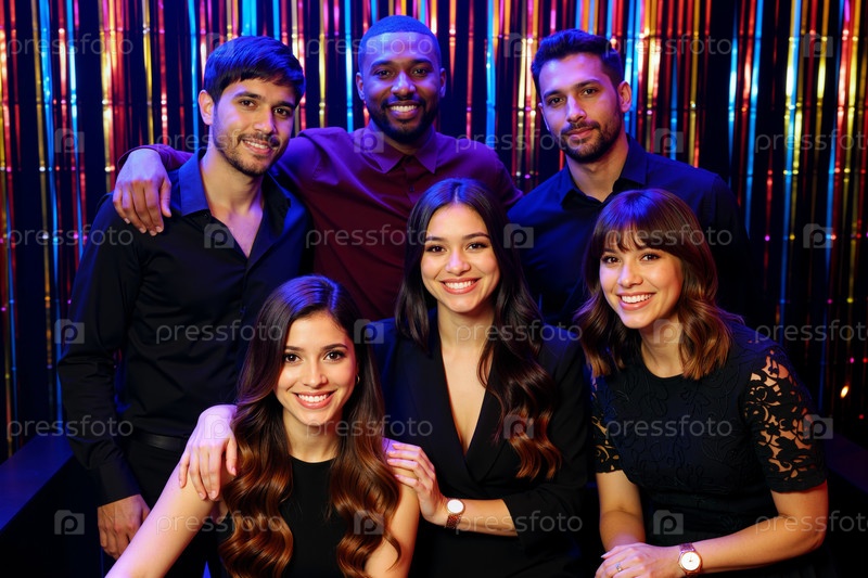 Группа молодых мультиэтнических взрослых, улыбающихся и позирующих вместе в помещении