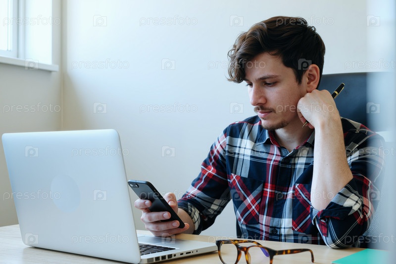 Молодой человек работает удаленно, используя смартфон и ноутбук