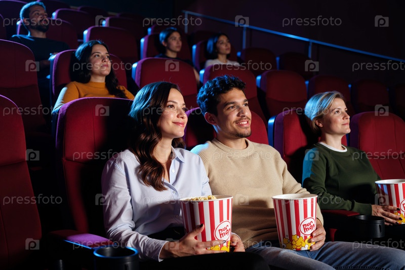 Молодые мультиэтнические взрослые смотрят фильм вместе в кино, едят попкорн