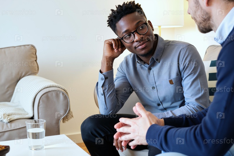 Молодой взрослый чернокожий мужчина внимательно слушает во время разговора с мужчиной
