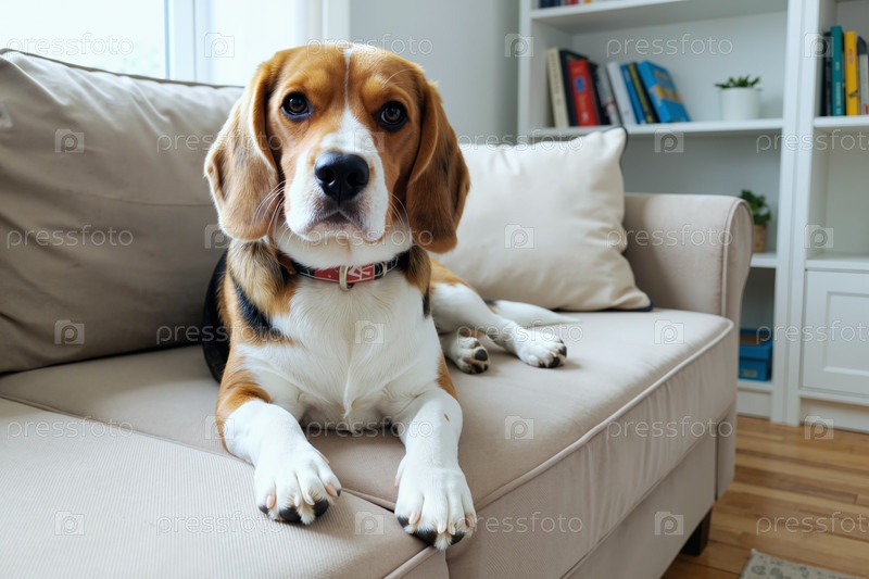 Собака Бигл лежит на диване и внимательно смотрит в яркой современной гостиной