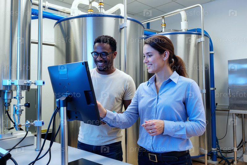 Молодая женщина и чернокожий мужчина сотрудничают с помощью компьютера в лаборатории