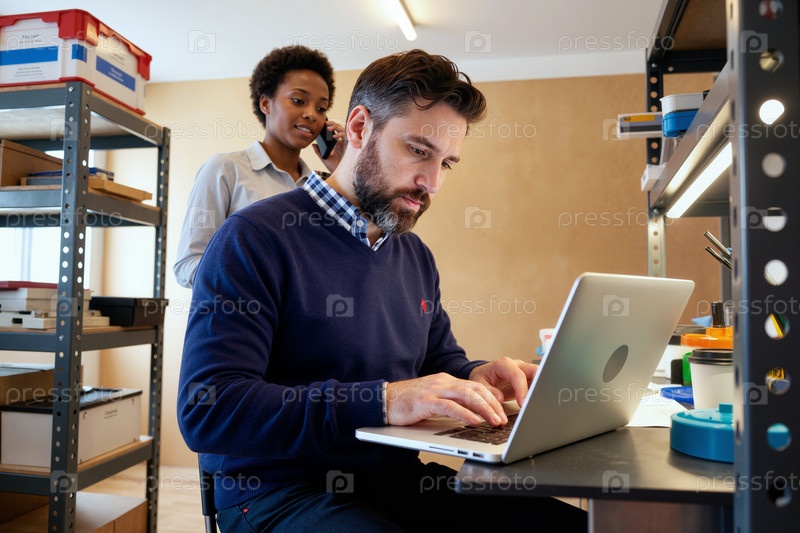 Молодой взрослый мужчина работает на ноутбуке, в то время как чернокожая женщина говорит по телефону