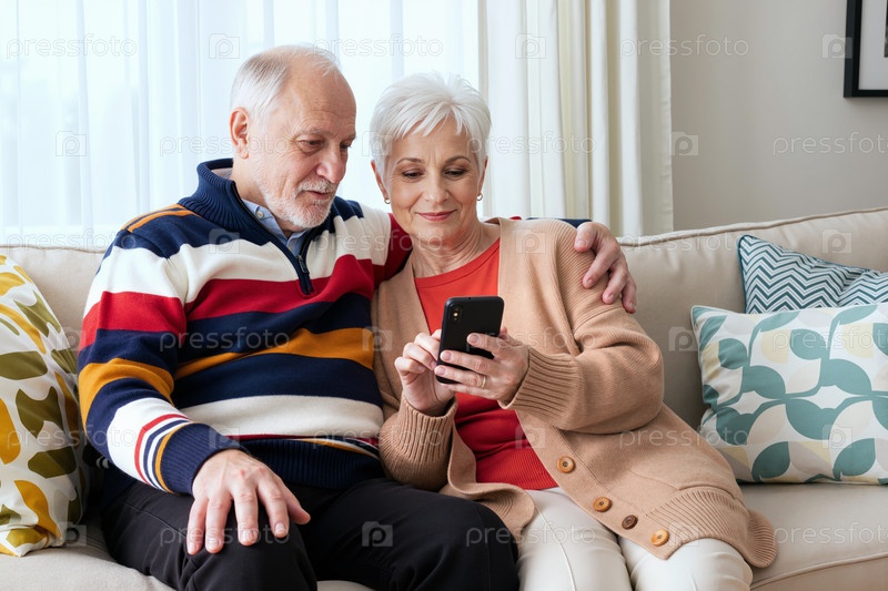 Старшая пара, сидящая вместе с помощью смартфона на диване дома