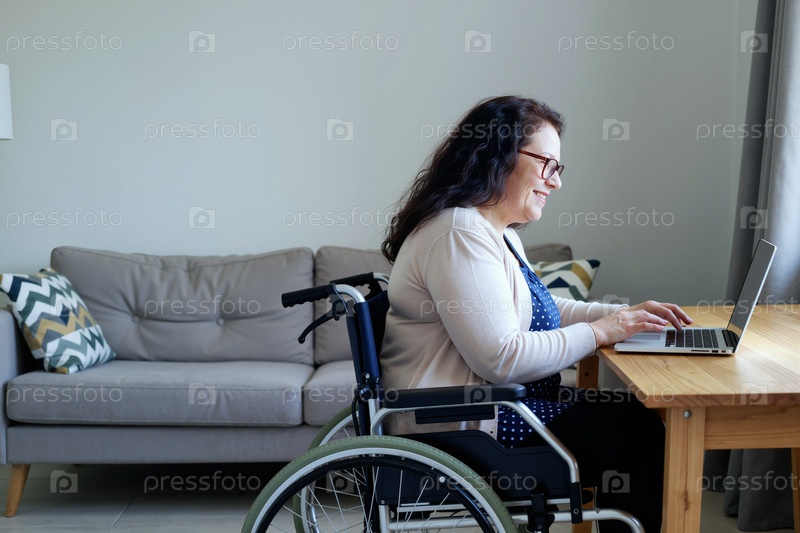 Женщина среднего возраста с инвалидностью использует ноутбук и улыбается в помещении