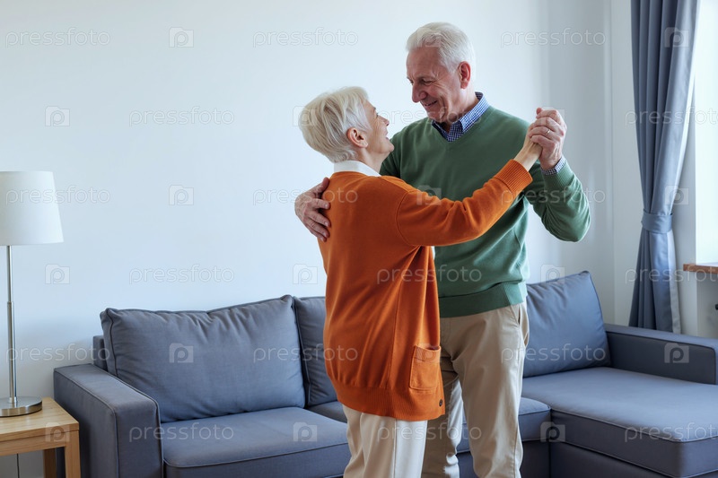 Старшая пара танцует вместе в гостиной, улыбаясь счастливо